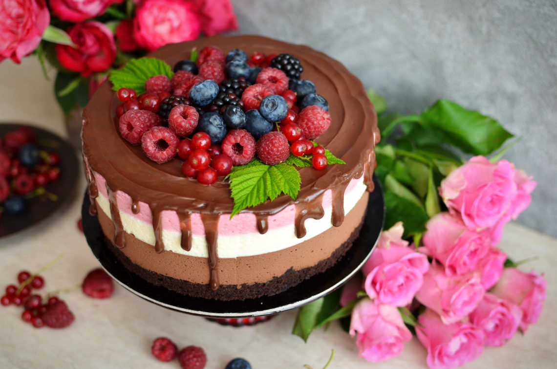 Drip-ul de ciocolata este de fapt un ganache de ciocolata pe care l-am pregatit astfel: smantana pentru frisca se incalzeste pana la punctul de fierbere, moment in care o luam de pe foc si adaugam ciocolata maruntita. Amestecam usor pana cand se topeste ciocolata si obtinem o crema densa dar care curge de pe lingura. In functie de procentul de cacao pe care il contine ciocolata, e posibil sa fie necesar sa ajustati cantitatile de frisca sau ciocolata. Lasam ganache-ul sa se raceasca putin si scoatem tortul din frigider. Indepartam inelul si folia si turnam ganache-ul de ciocolata in centru. Distribuim pe toata suprafata tortului si lasam sa curga din loc in loc astfel obtinand efectul de drip. Decorati cu fructe de padure dupa cum va place si bucurati-va de un tort absolut delicios.